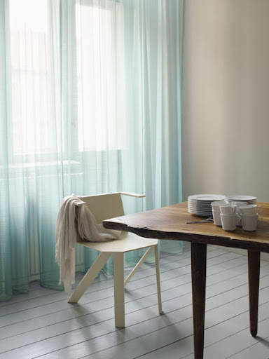 Een andere opvallende nieuwigheid zagen we in een eigentijdse toepassing van 'vitrages'. Diverse huizen hebben prachtige transparante gordijnstoffen in hun gamma. Geen witte of roomwitte voiles meer maar wel vrolijke of sterke kleuren. Waar onze oma's de vitrage achter het sluitgordijn hingen, opteren we vandaag voor sluitgordijnen achter de vitrages. We kiezen een sobere gordijnstof én een voile in dezelfde tonen: heel sfeervol en luchtig! Vanaf volgende maand ook te zien in onze etalage. Je komt dan toch een kijkje nemen?